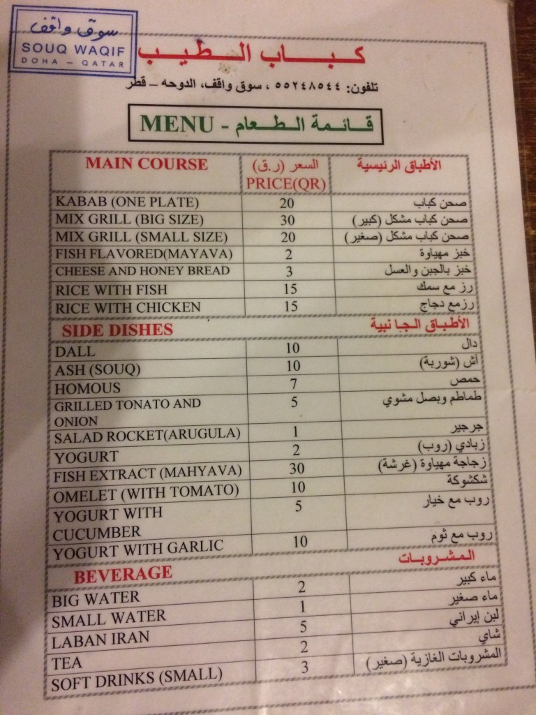 - Souq Waqif: at night the souq area comes to life and you can experience a different scenery – lots of tourists and locals, music, colours, shops and cafes. For a an amazing traditional meal visit the restaurant inside the Souq (pictures below), you will not regret the decision. Here you can find the best chicken grill and houmus, served in an authentic local environment. The prices are very convenient and you will find a lot of locals eating here (way more than tourists).