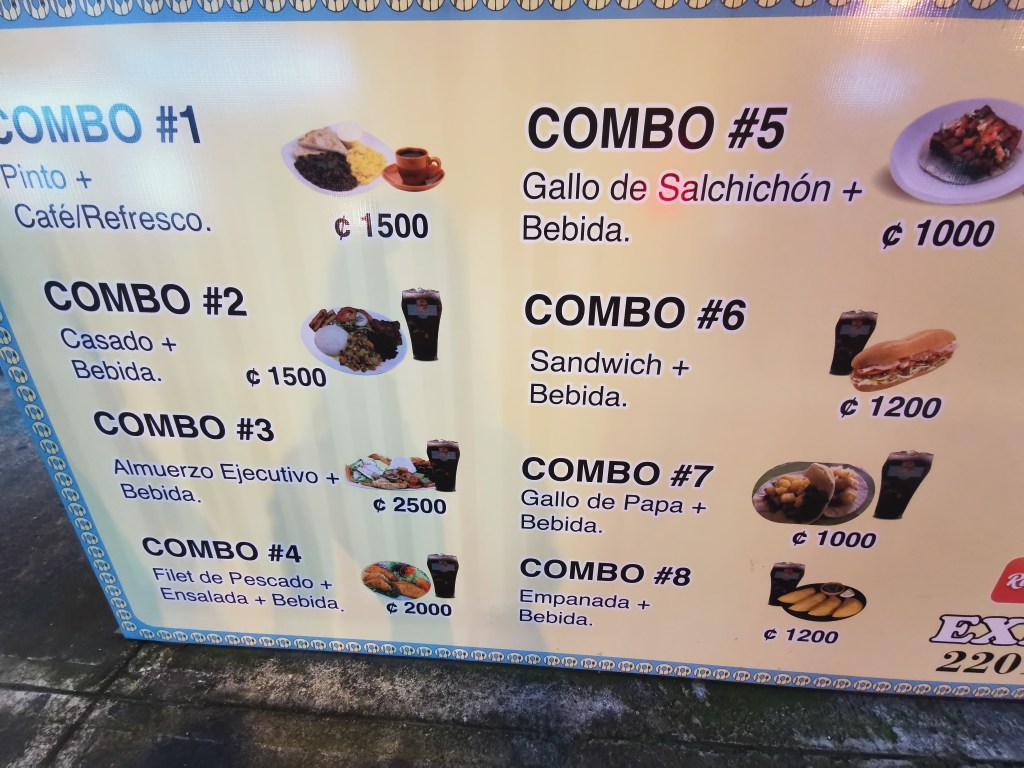 | Food and Drinks | Description | Cost in CRC per 2 persons | Price in EUR per 2 persons |